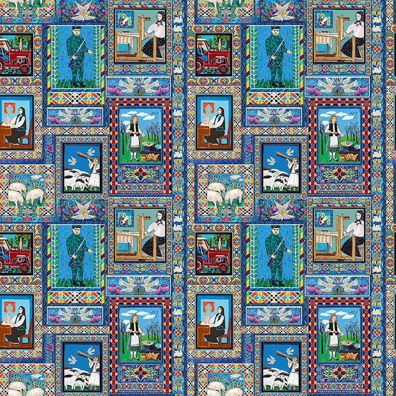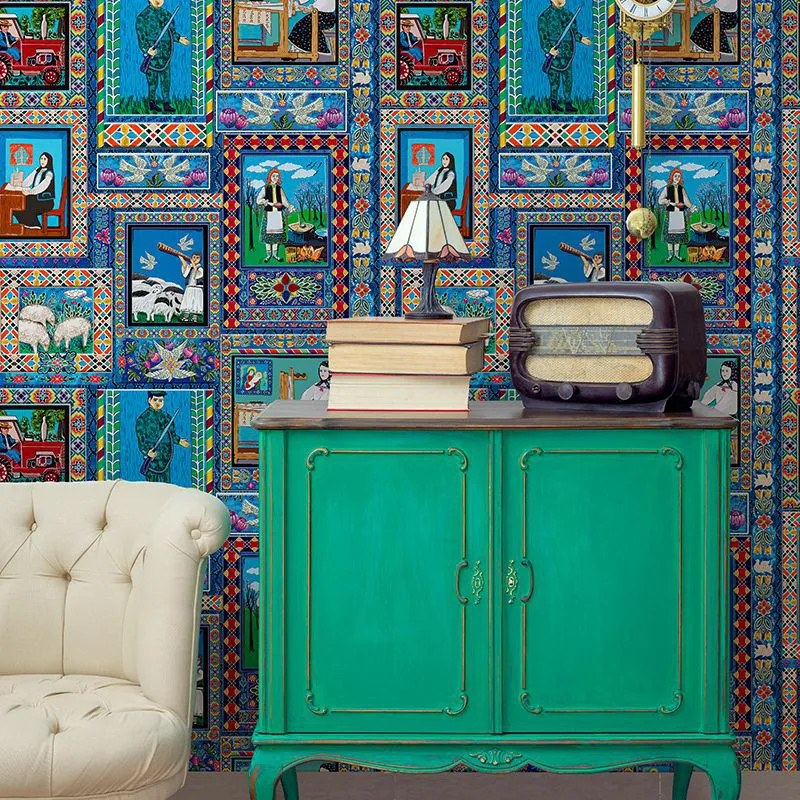 Le motif de papier peint Ornament est réalisé dans le style de l'Art Naïf, rappelant les artistes et peintres populaires qui ont créé dans ce territoire. C'est une collection de souvenirs, une série de scènes exposées pertinentes et révélatrices de la vie quotidienne de nos ancêtres. Le modèle encadre un univers coloré, joyeux et humoristique, peint à la main par nos designers sur un fond abondant de bleu Sapanta. L'histoire du cadre est parsemée de symboles, de broderies distinctes dans le temps, le tout enveloppé dans un papier peint ayant la valence d'un tableau. La palette de couleurs utilisée vibre de vie, tout comme les personnages soigneusement capturés dans différents poses. Les figures épiques deviennent des éponymes du domaine réaliste-fantastique auquel elles appartiennent, représentant des scènes de vie naturelles, significatives et symboliques pour nos racines, ainsi que pour toute la tradition roumaine. Le modèle de papier peint Ornament donne à l'espace où il est accueilli une atmosphère pleine d'admiration et de beauté, d'amour pour les coutumes du passé, devenant l'attraction principale dans tout type de décor. Ornament papier peint - Collection Poema Romana La collection Poema Romana encapsule graphiquement l'esprit inébranlable, évolutif et surprenant des Roumains. Elle prend son envol, audacieuse et fluide, dans un voyage à travers le temps. Elle atteint des terres anciennes, où le réel et le mythique s'entrelacent et fusionnent, où la vie et la mort dansent ensemble. Nos créations entremêlent magistralement les mêmes éléments éternels, réunissant l'ancien et le nouveau, l'absurde et le concret, le traditionnel et le moderne. Les racines de la création, profondément enracinées dans la terre sous nos pieds, nous encouragent à explorer l'héritage culturel transmis de génération en génération. Au cœur de nos Tapisseries, le point focal est la tradition, dans toute sa plénitude. Ainsi, après s'être imprégné de beauté, nous rentrons chez nous avec notre carquois plein d'inspiration et nos âmes prêtes à créer. Nous nous engageons à prendre des éléments de la grammaire roumaine, des coutumes et des traditions et les rendre sous une forme moderne et audacieuse, à travers des textures et des motifs superposés, avec des touches surprenantes de néon et de graffiti. Par amour et respect pour la nature, toutes nos tapisseries sont fabriquées à partir de matériaux naturels, écologiques et biodégradables. C'est pourquoi, dans notre processus de production, nous utilisons une base en Vlies, un matériau non tissé, extrêmement résistant et facile à installer.